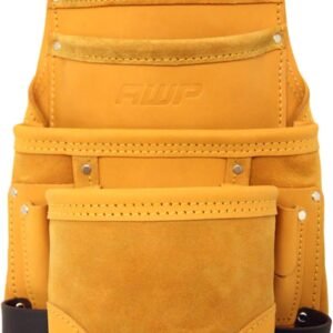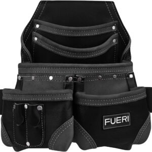 Comprar AhoraFUERI Leather Tool Pouch for Carpenters 5 Pocket Framers Belt Bag Kit | Heavy Duty Bag with Tape Holder | Rig Riveted Tool Organizer – Reinforced Seams (Black)