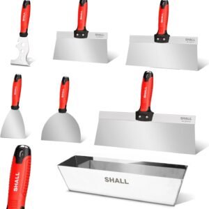 SHALL Drywall Knife Set, 7 Pcs Stainless Steel Drywall Hand Tool Kit Includes Putty knife, Taping knife, Painter Scraper Tool & 12″ Mud Pan for Joint Taping, Finishing, Patching on Drywall, Wallpaper