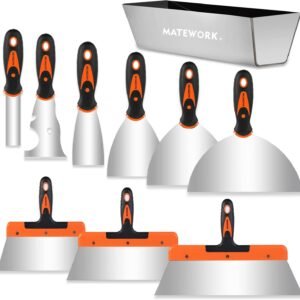 Comprar AhoraPutty knife,10 Piece Stainless Steel Paint Scraper Tool Set,14″ Mud Pan for Repairing Drywall, Removing Wallpaper, Applying Putty, Plaster, Cement, Adhesive