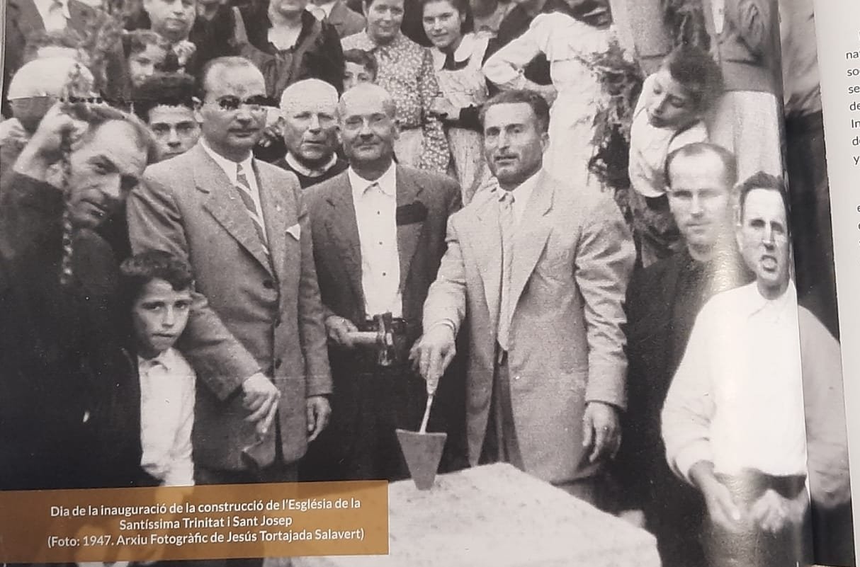 a la derecha Antonio Tamarit Aliaga apodado ” El Obrer” con su paleta ,a la izquierda con el pañuelo blanco el arquitecto Juan Pedro Segura de Lago, al medio el Alcalde apodado Garrina,detrás el cura Joaquín Barbera